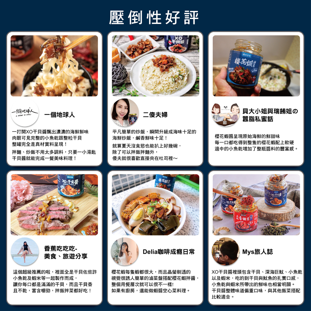 綜合6入組辣味豆哥 花椒香辣醬_橄欖油_小辣 170克/罐*1辣味豆哥 XO干貝醬_原味 170克/罐*1辣味豆哥 XO干貝醬_辣味 170克/罐*1辣味豆哥 麻油老薑醬_無添加 170克/罐*1辣味豆哥 櫻花蝦拌醬 240克/罐*1辣味豆哥 紅蔥酥拌醬 240克/罐*1送贈品:辣味豆哥 椒麻醬汁 28克*1包辣味豆哥 麻油薑醬汁 28克*1包